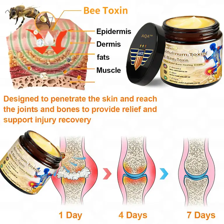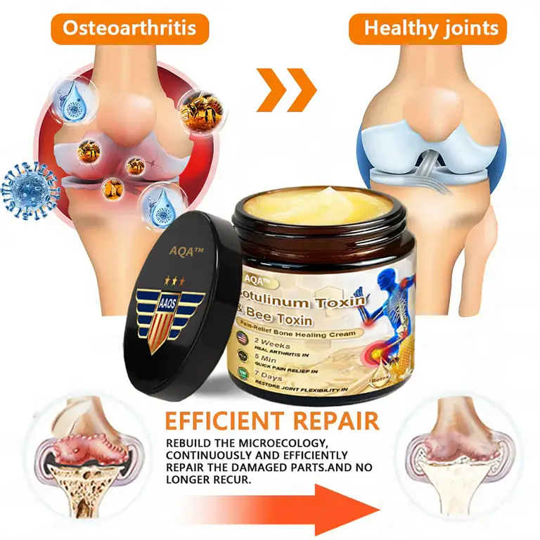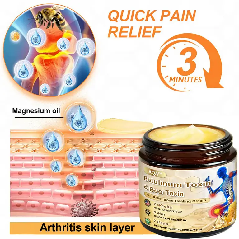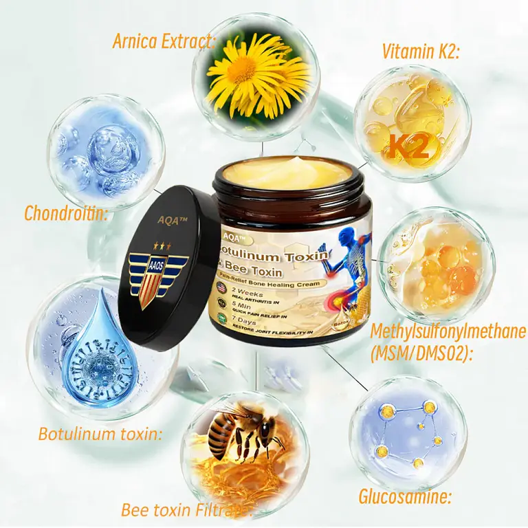 AQA™ Bone Healing Cream relieves pain in 3 minutes, restores joints in 7 days, and heals arthritis with botulinum and bee toxin technology.