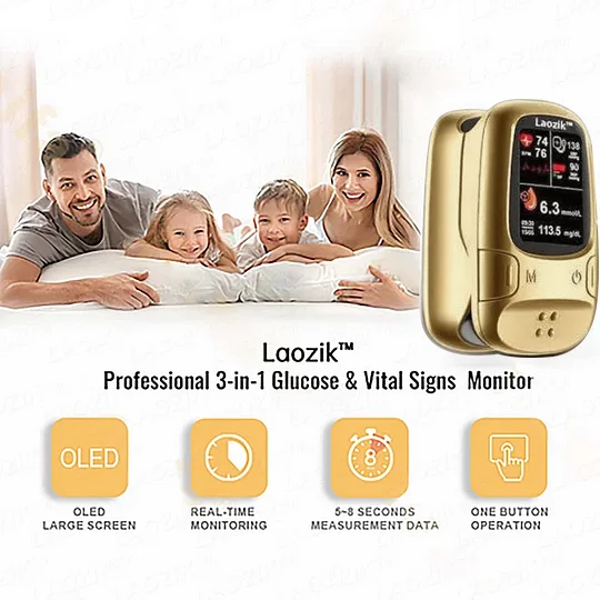 Laozik™’s latest innovation, the multifunctional non-invasive laser glucometer, integrates cutting-edge technologies for superior health monitoring. Equipped with a low-energy smart control chip and utilizing the advanced ‘LAMBERT BEER’ algorithm, this device ensures highly accurate measurements. It combines photon chip technology and silicon with light absorption spectroscopy to provide reliable, non-invasive monitoring of blood glucose, blood pressure, and blood oxygen levels. Certified by Health Canada, the device includes six display functions for easy and comprehensive health tracking. Whether you’re managing diabetes, monitoring cardiovascular health, or tracking oxygen levels, Laozik™ offers a reliable, all-in-one solution for your health needs.